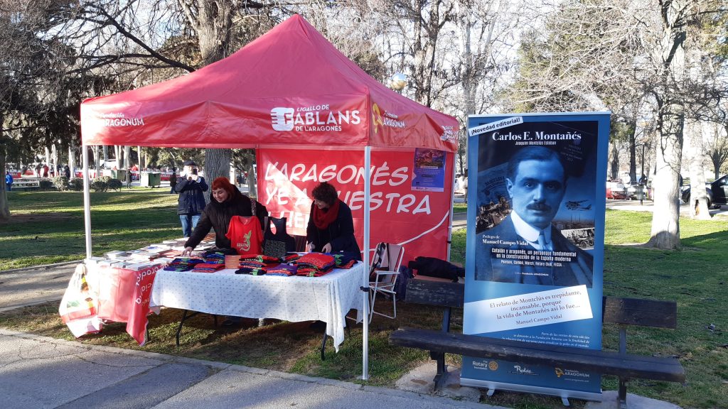 Este año, la Fundación Aragonum y Ligallo de Fablans de l’Aragonés estrenaron una flamante carpa con un mensaje fundamental: “L’aragonés ye a nuestra luenga”. Los voluntarios de Fablans estuvieron toda la jornada repartiendo números de la revista Orache y realizando suscripciones, informando sobre nuestros cursos de lengua aragonesa, charlas, excursiones, colonias de verano, etc, así como atendiendo nuestra botiga o tienda, con los productos tradicionales: CD de música tradicional, libros y cómic en aragonés, y nuestras ya clásicas y famosas camisetas con dragones o palabras en aragonés. Nuestra valoración no ha podido ser más positiva, con muchísimas personas interesadas en nuestras actividades y productos, lo que delata una arraigada sensibilidad hacia nuestra lengua y cultura. Todo un éxito. El año que viene, más.