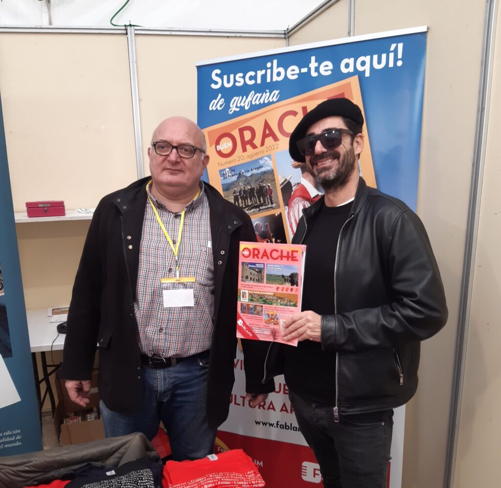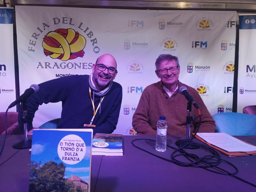 Este año también contamos con la presentación y firma de ejemplares de un libro editado en 2024 por un prolífico escritor en aragonés, nuestro amigo Chusé Damián Dieste, autor de “O tión que tornó d’a dulza Franzia”, una magnífica novela que transita, a mitad de camino, entre los personajes reales e imaginarios, con el fondo escénico de los bonitos paisajes de la Honor de Marcuello, en la Hoya de Huesca.