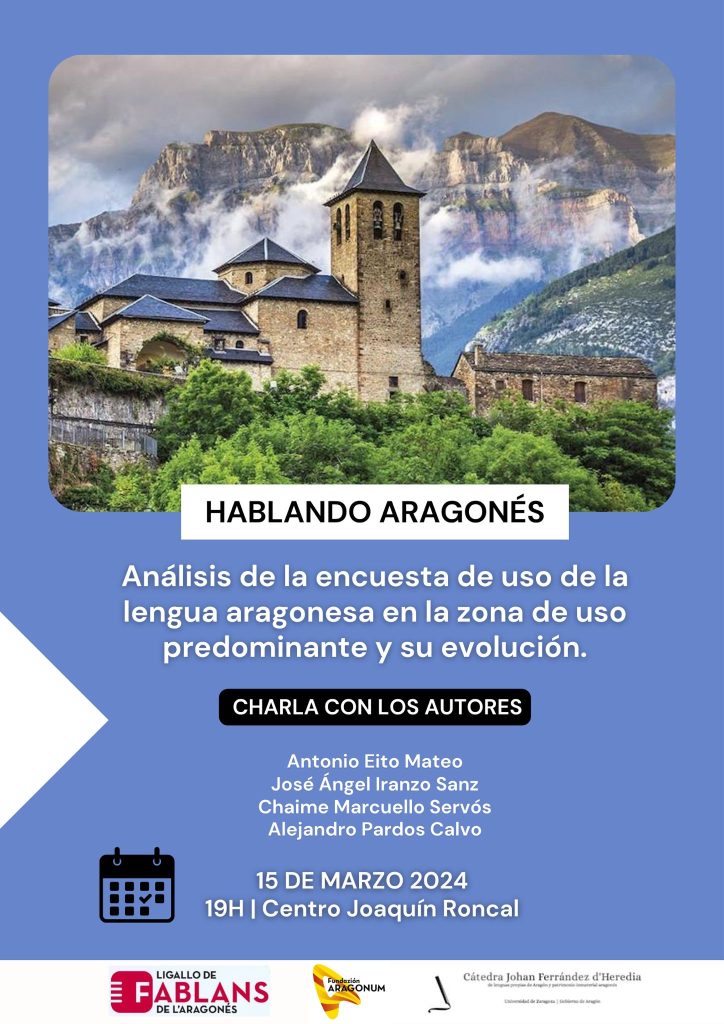 La Fundación Aragonum y el Ligallo de Fablans de l’Aragonés presentaron el pasado 15 de marzo en el Centro Joaquín Roncal de la Fundación CAI, el “Análisis de la encuesta de uso de la lengua aragonesa en la zona de uso predominante y su evolución”, realizado por los sociólogos de la Universidad de Zaragoza Antonio Eito, Chaime Marcuello y Alejandro Pardos, y el especialista en estadística e investigación operativa de esta institución José Ángel Iranzo. Este trabajo ha sido promovido por la Cátedra Johan Ferrández d´Heredia de Lenguas Propias y Patrimonio Inmaterial de Aragón, con el apoyo de las comarcas de Ribagorza, Hoya de Huesca/Plana de Uesca y Jacetania, así como de la Dirección General de Política Lingüística del Gobierno de Aragón.