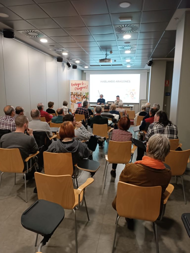 Más de 30 personas asistieron a la presentación, que fue realizada por Chaime Marcuello y Alejandro Pardos. En ella explicaron, con todo lujo de detalles, cómo se había realizado el proyecto, en base a las más de 1.000 encuestas, realizadas durante el año 2023, en 60 municipios altoaragoneses de las comarcas de Cinco Villas, Hoya de Huesca, Jacetania, Alto Gállego, Monegros, Somontano, Sobrarbe, Ribagorza, Cinca Medio y La Litera -las zonas de uso predominante del aragonés y también del catalán fueron delimitadas en el Anteproyecto de Ley de Lenguas de 2001-.